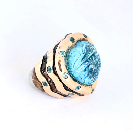 Large Heart Engraved Blue Topaz Set in Gold and Blue Topaz "Signature" Ring