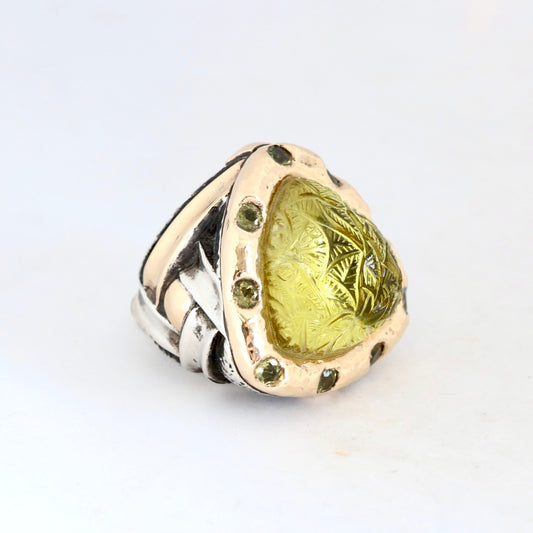 Large Blue Lapis Trimmed in Gold Braid and Fern Leaves Shank "Signature" Ring