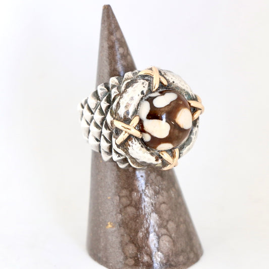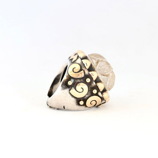 Large Domed Engraved Quartz Set in Gold Triangles "Signature" Ring