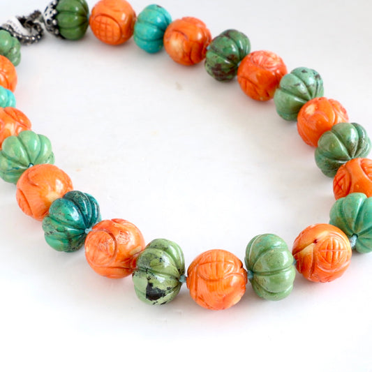 Chunky Engraved Coral & Turquoise Ball "Signature" Necklace