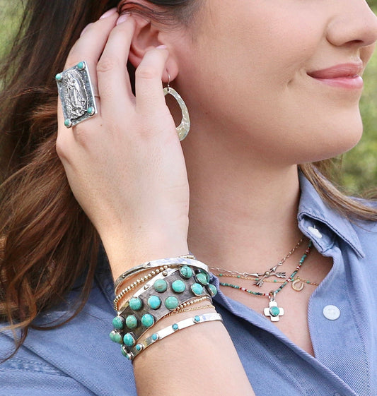 Richard Schmidt's designs are a mix of modern style and rugged spirit, stories told in silver, gold, turquoise, coral, and brilliant semi-precious stones. The hammered sterling silver gives each piece a distinct texture and tone while the detailed oxidation offers striking depth. When composed together, you get a real showstopper of a piece. Hand-crafted with heart and soul in La Grange, TX!