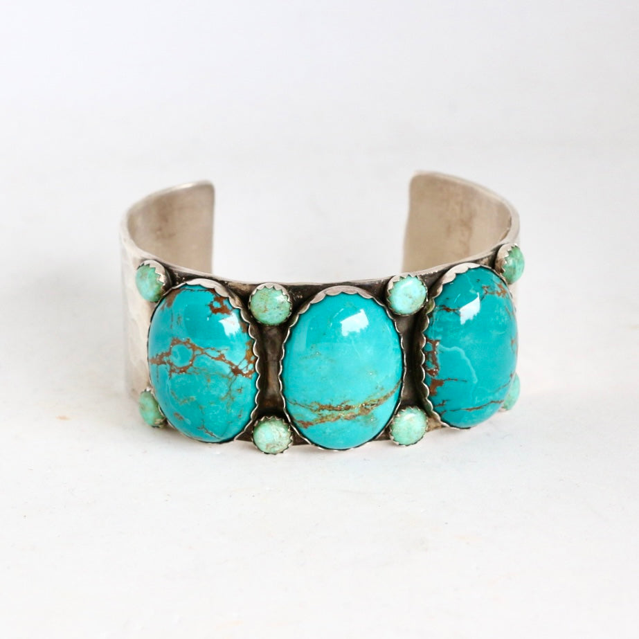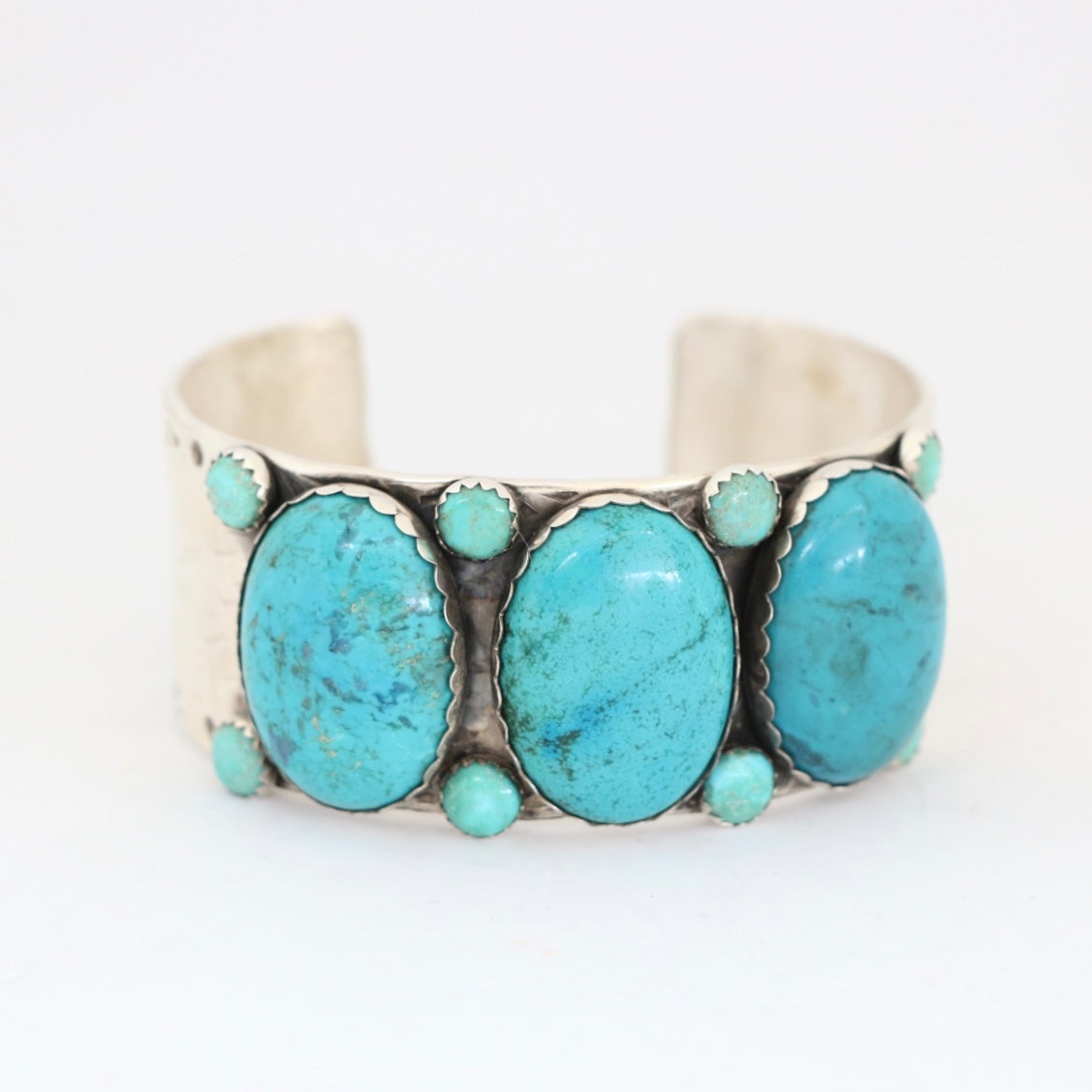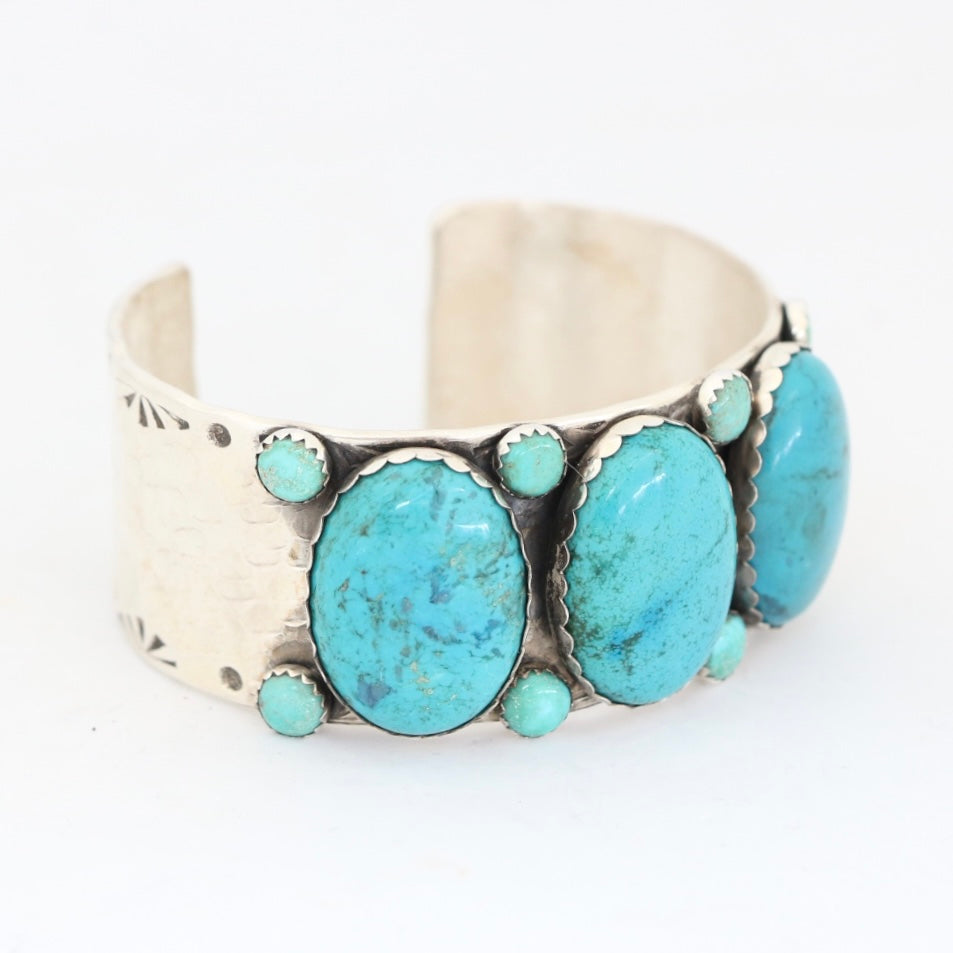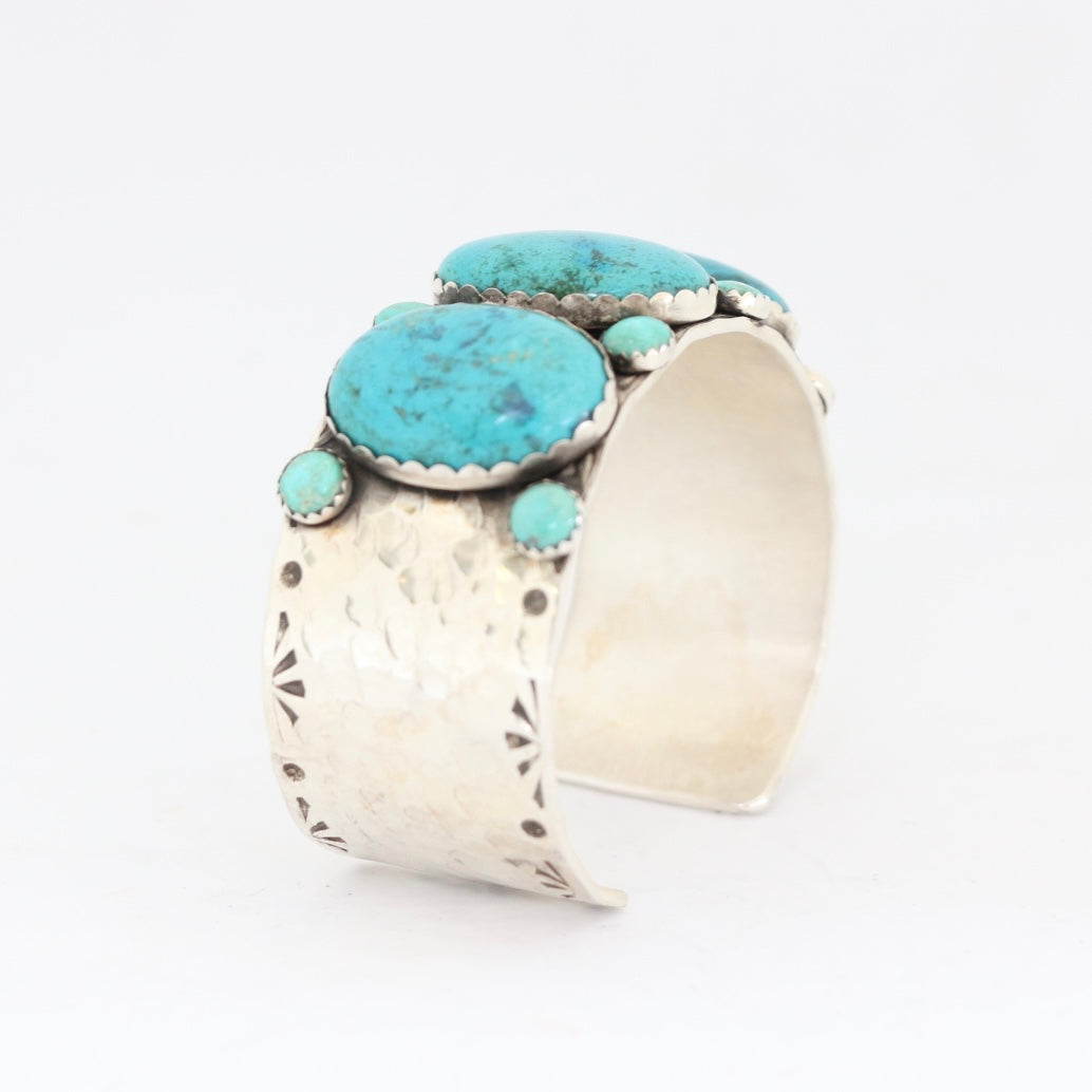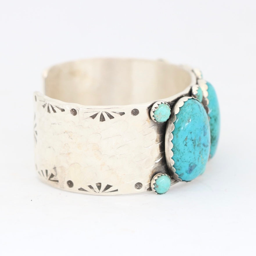- 1 inch stamped sterling silver hammered cuff with (3) 1 inch oval turquoise stones and (8) 6mm small turquoise stones