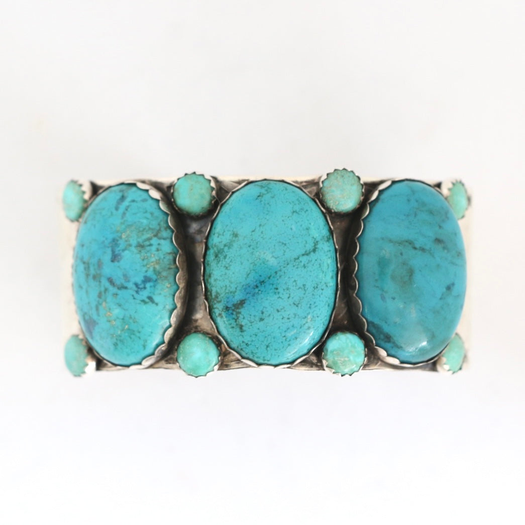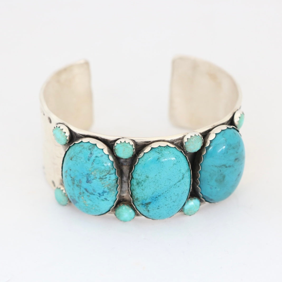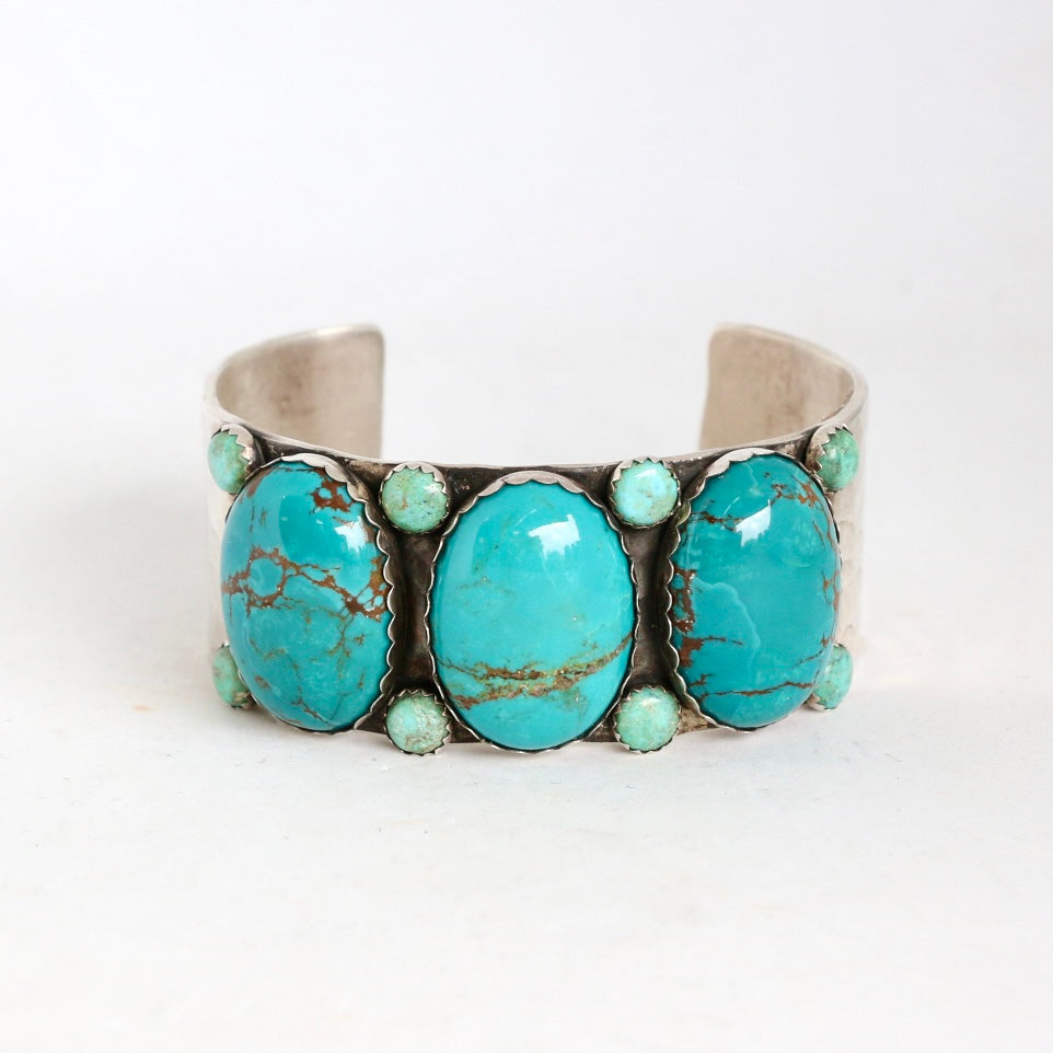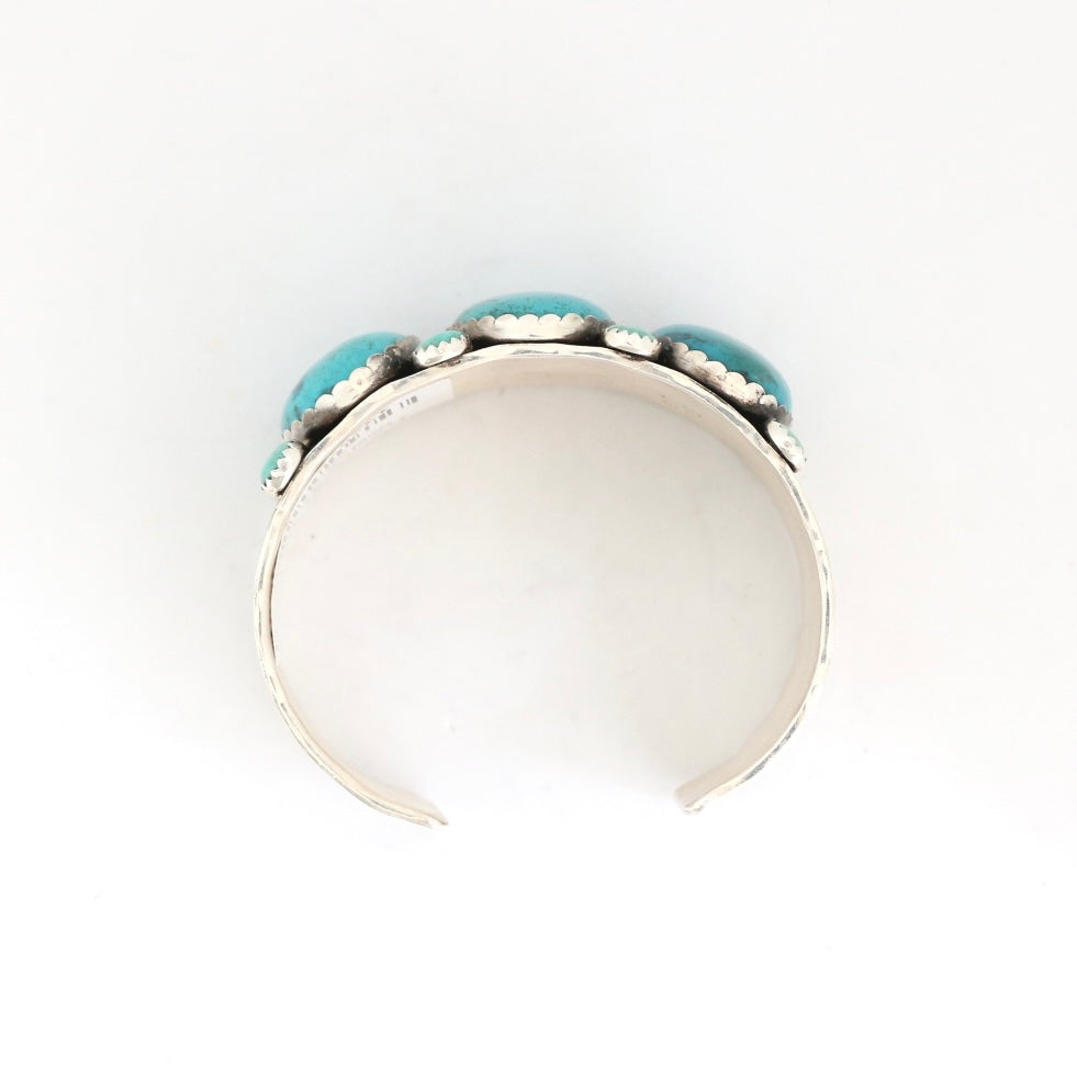 - 1 inch stamped sterling silver hammered cuff with (3) 1 inch oval turquoise stones and (8) 6mm small turquoise stones