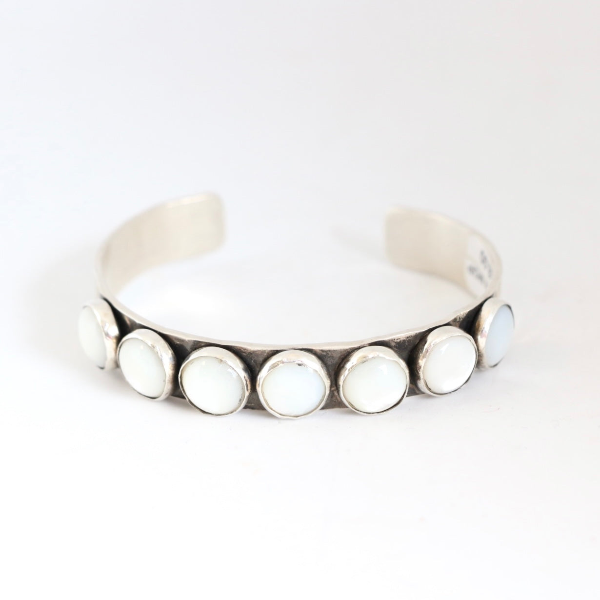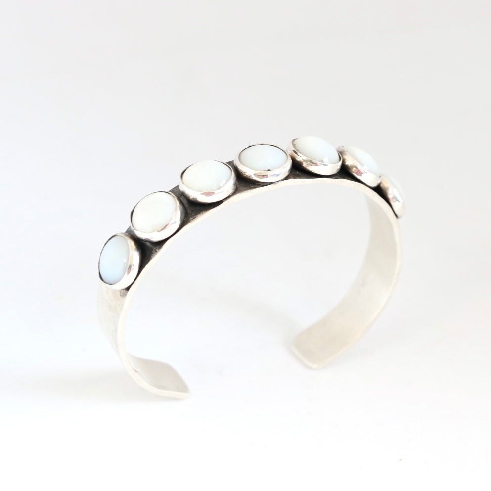 - Hammered sterling silver cuff with (7) 10MM Mother of Pearl stones
