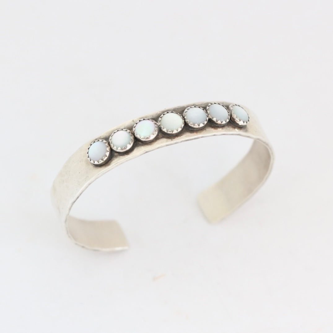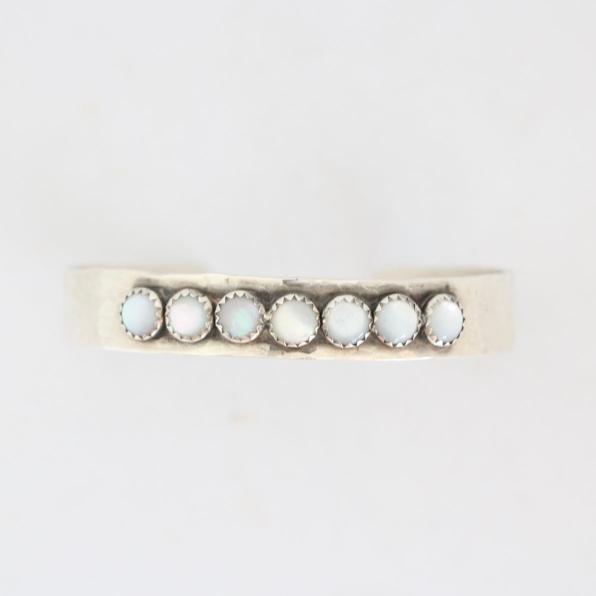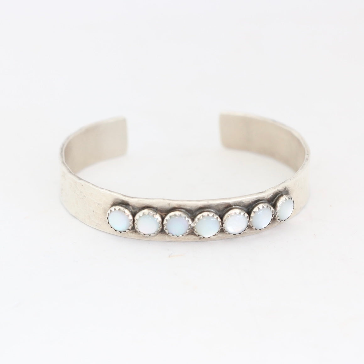 - 10MM wide hammered sterling silver cuff with (7) 6MM Mother of Pearl stones