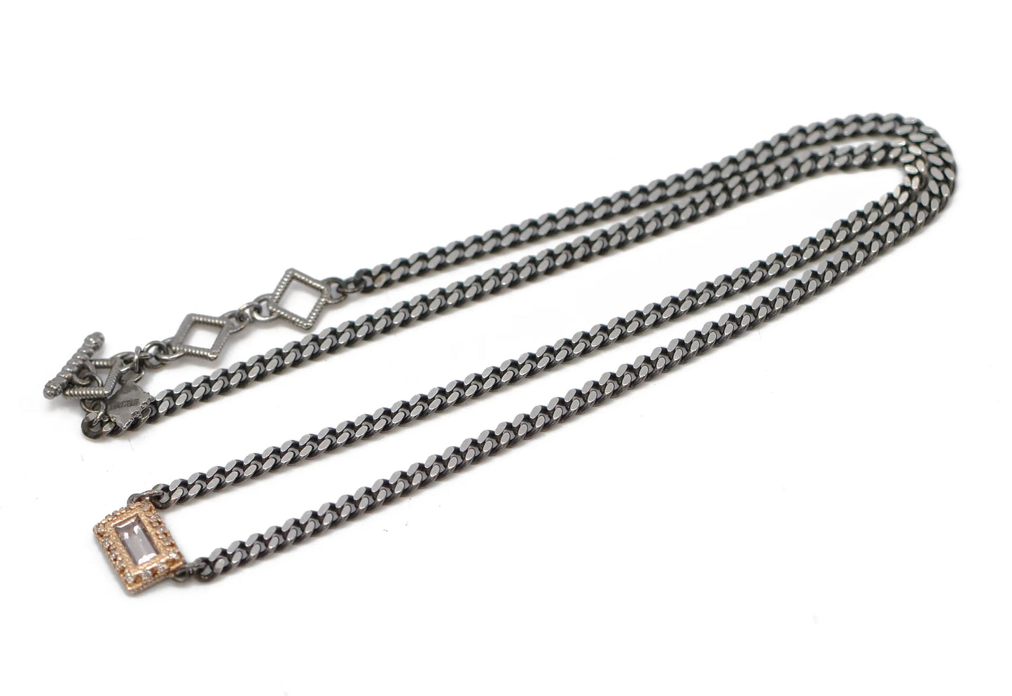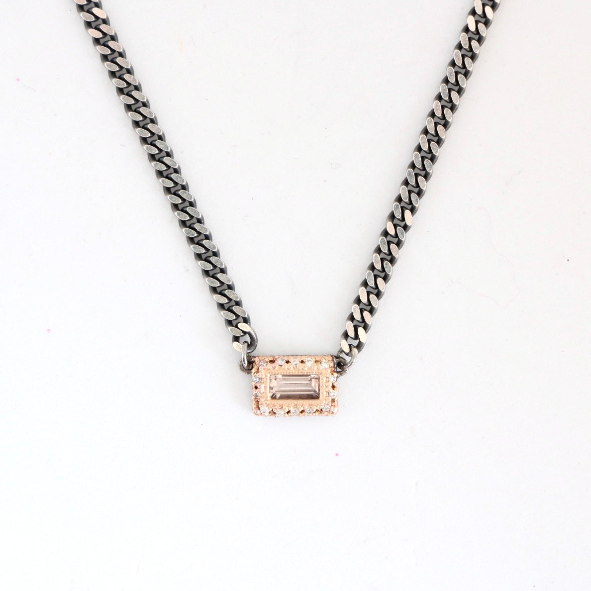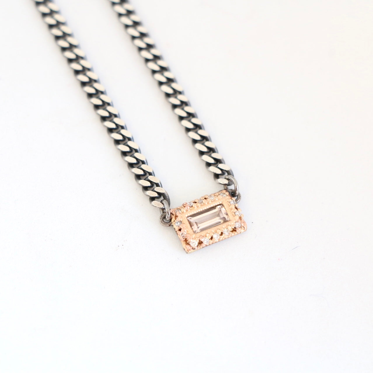 - 14k Rose Gold and Grey Sterling Silver Necklace with 0.07 CT White Diamonds and 6x3m Baguette Peach Morganite.
