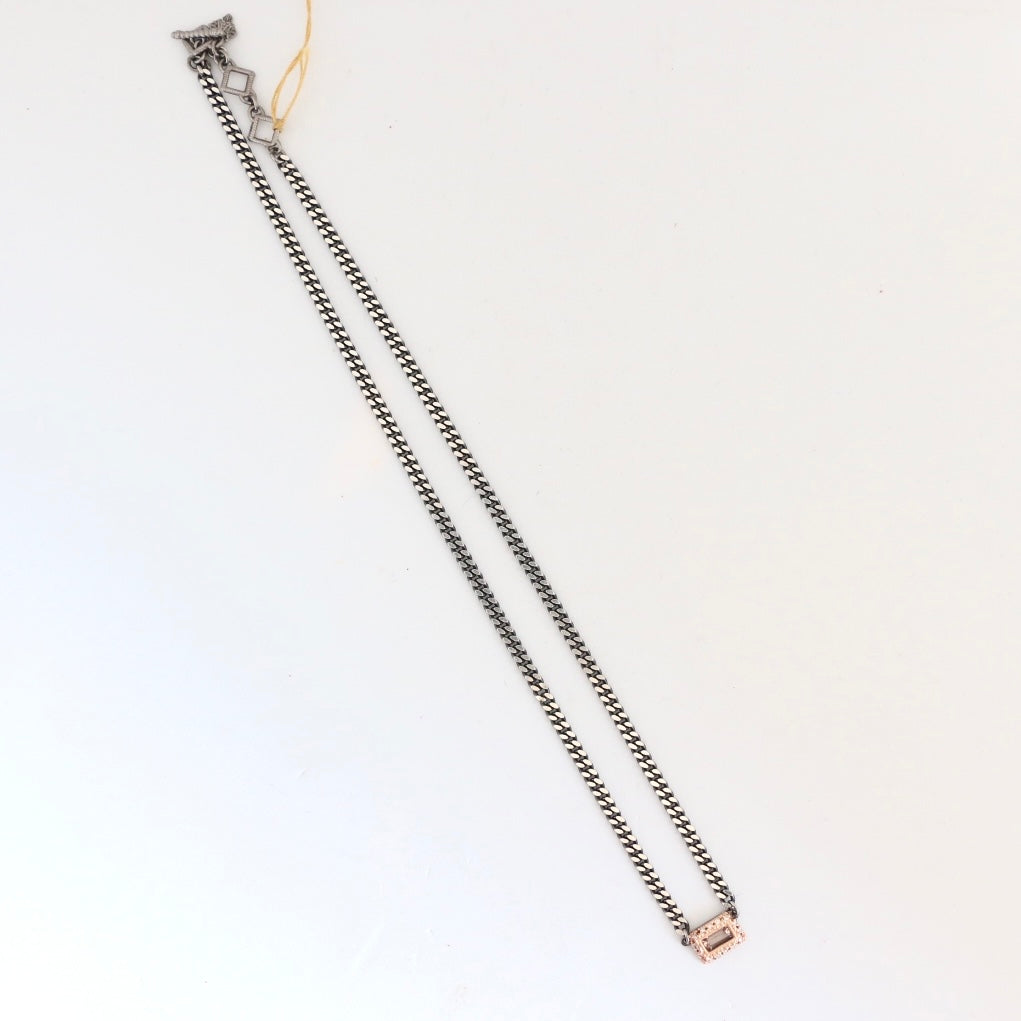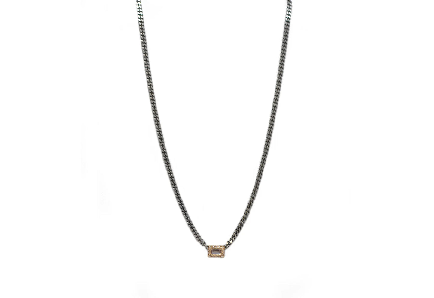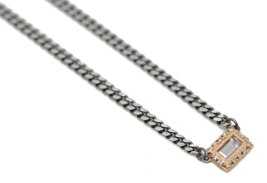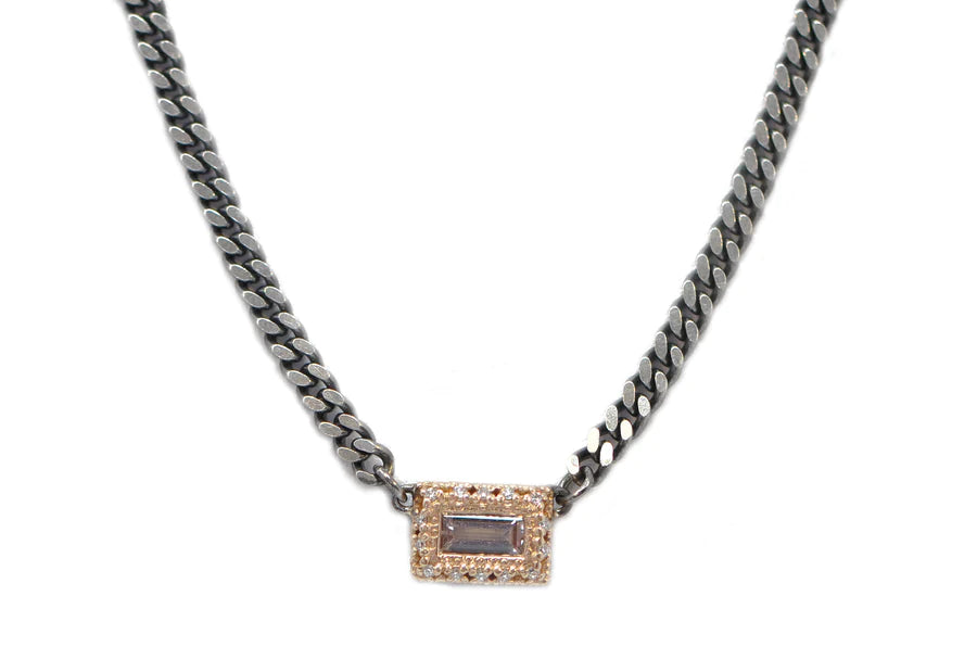- 14k Rose Gold and Grey Sterling Silver Necklace with 0.07 CT White Diamonds and 6x3m Baguette Peach Morganite.