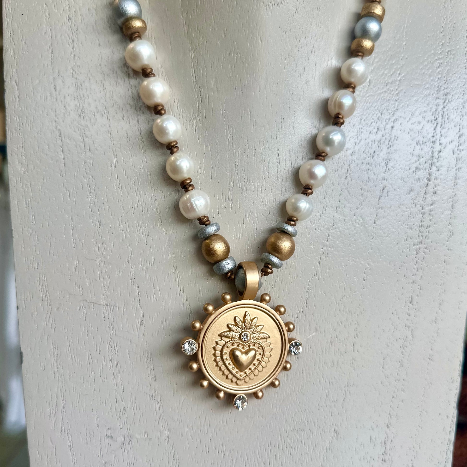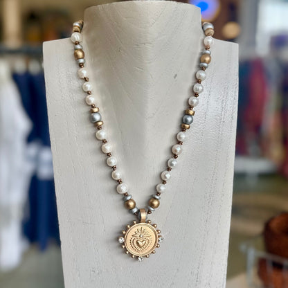 20" Pearls with Sacred Heart Gold Pendant Necklace