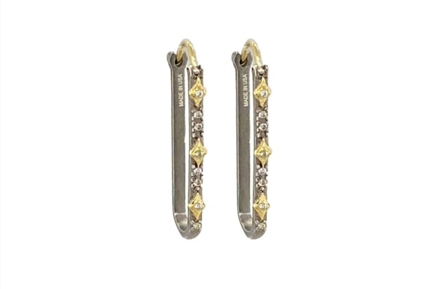 - Old World 18k yellow gold and grey sterling silver 26 mm paperclip pave crivelli earrings with white and champagne diamonds.