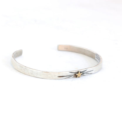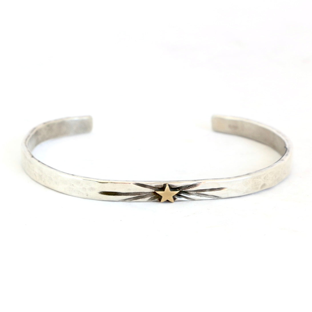 This 4mm hammered sterling cuff features a tiny 14k gold star set against a starburst-etched design, perfect for mixing your gold and sterling pieces with a fun twist.