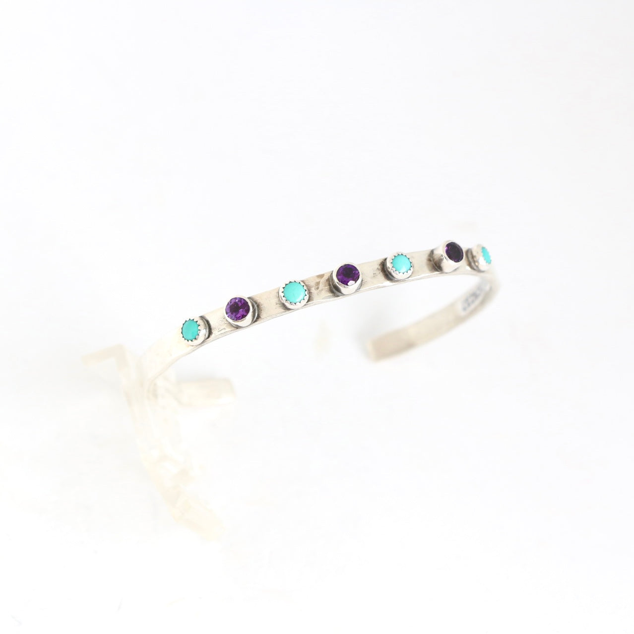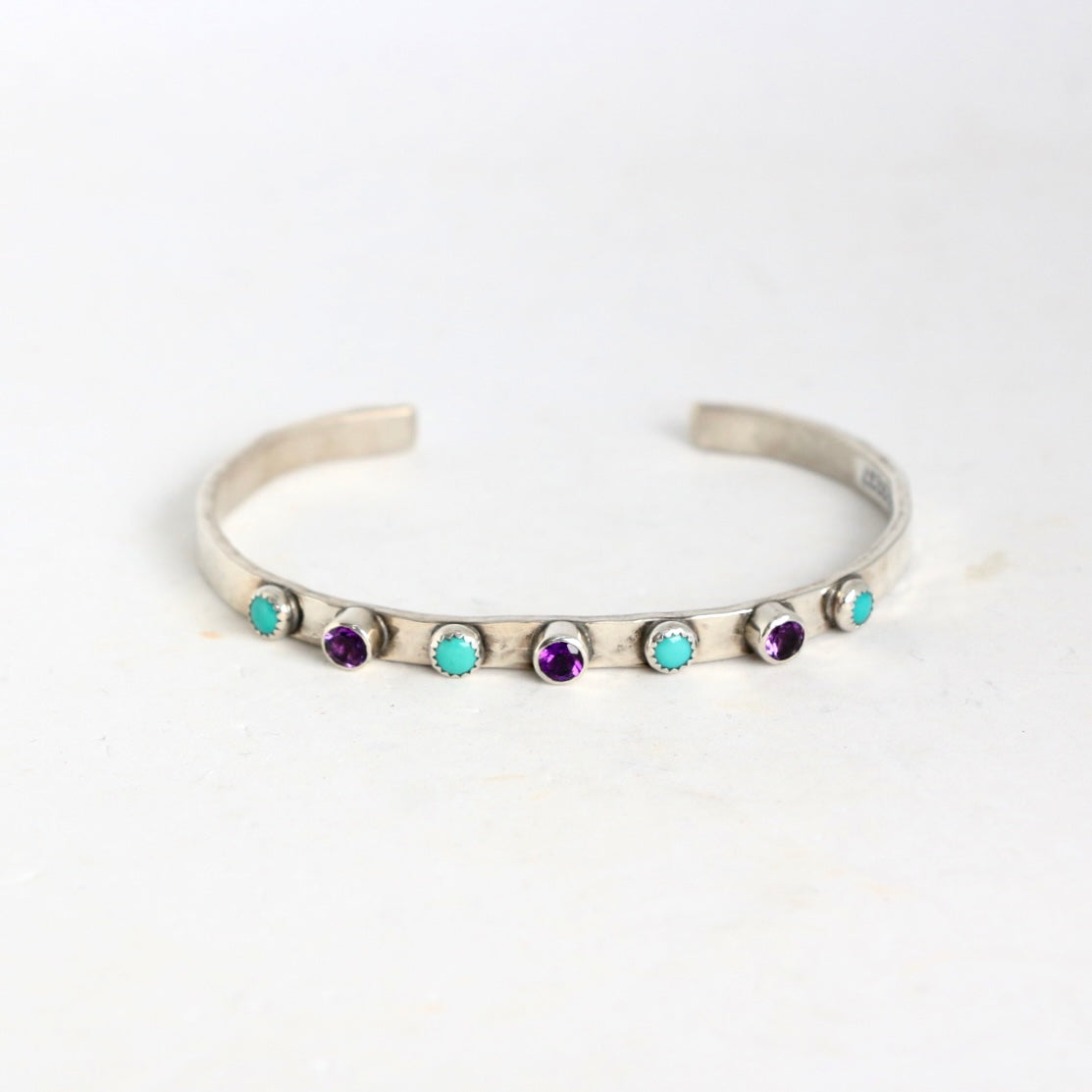 - 4mm sterling silver hammered cuff with (4) 4mm turquoise stones and (3) 4mm purple topaz gemstones