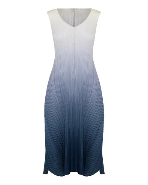 The Short Estrella Dress is handcrafted with Alquema’s signature vertical pleating, this sleeveless silhouette features a subtle V-neckline and a slim-fitting bodice that gently flares into a full, flowing skirt. Reminiscent of a waterfall, the ombré dye technique creates a seamless transition of tones, bringing movement and light to every fold.