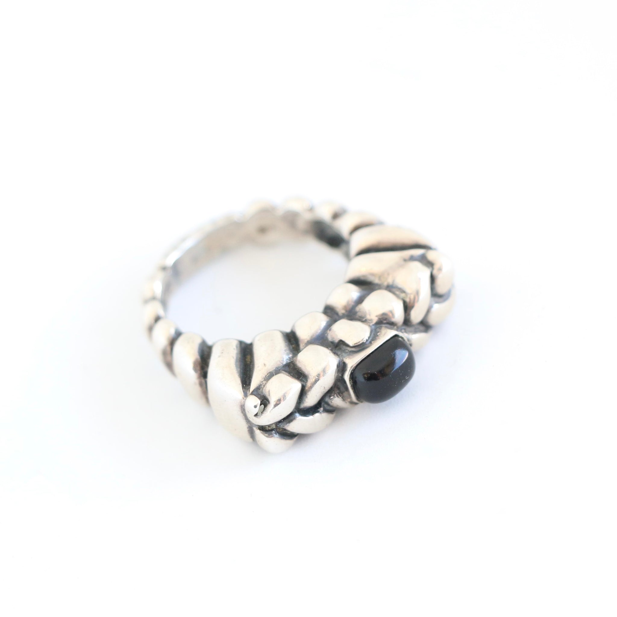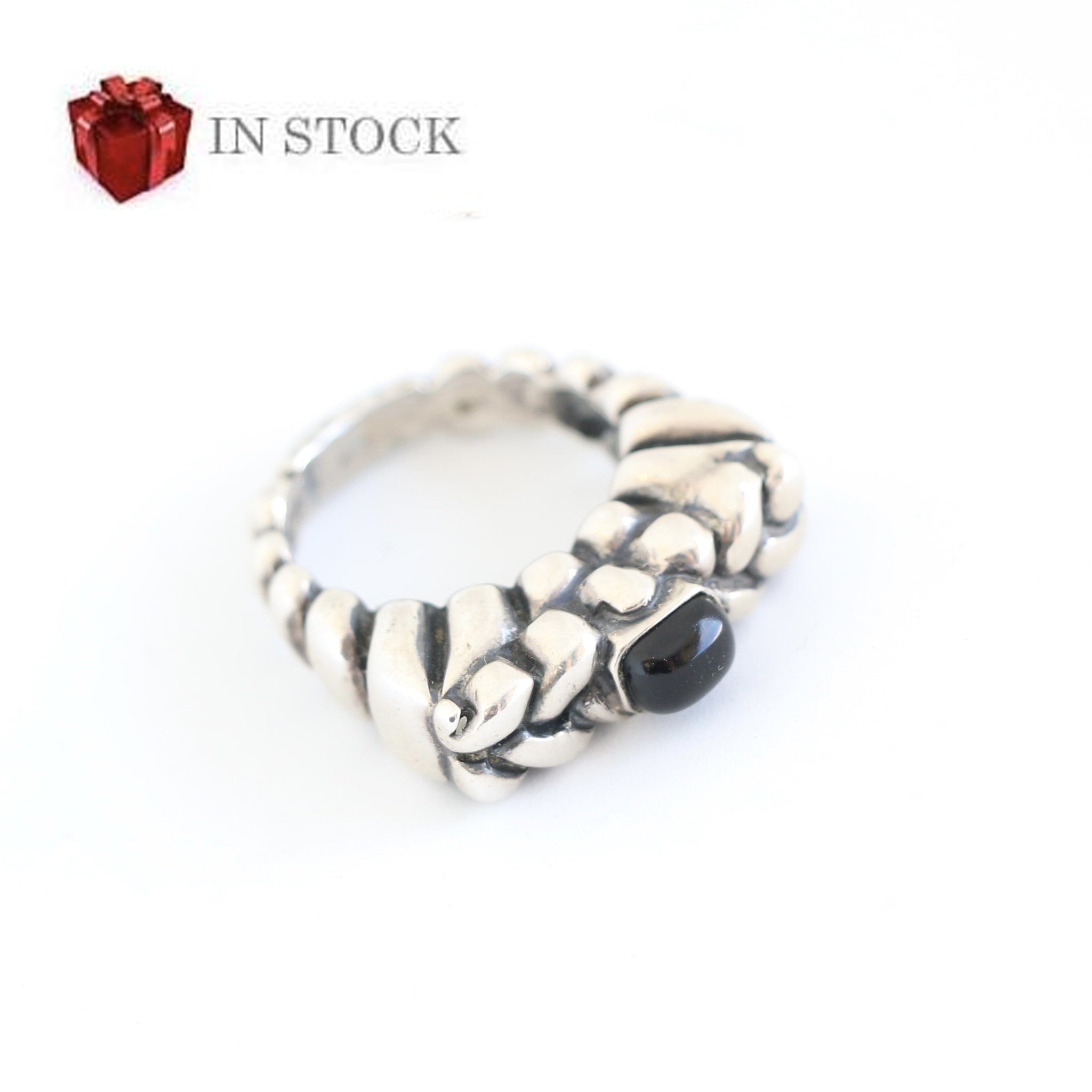 - Small black onyx stone braided designed top with sterling silver twisted puff shank