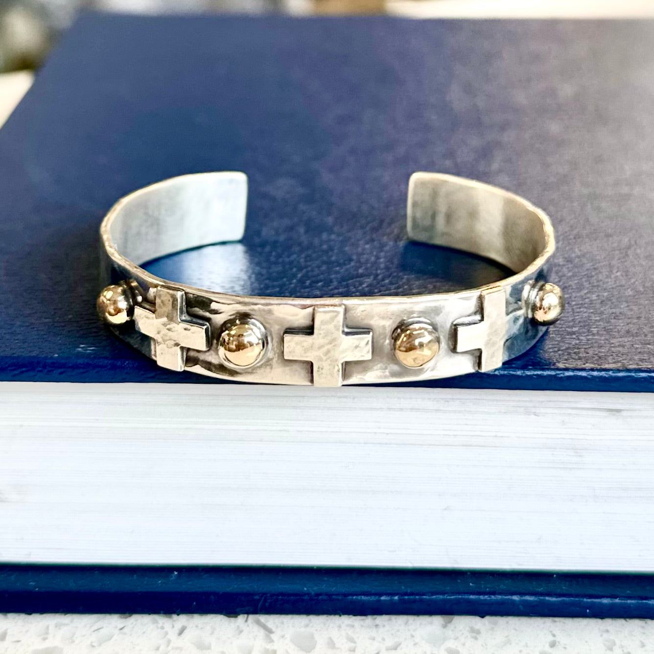 - 10mm sterling silver hammered cuff with (3) 10mm silver crosses and (4) 14kt gold large puffy bubbles