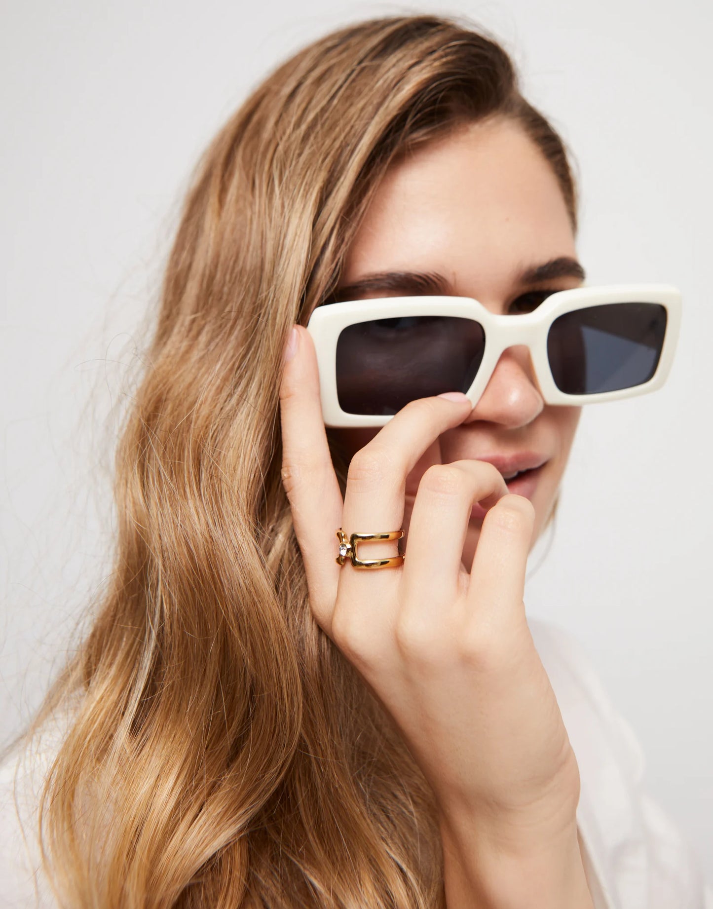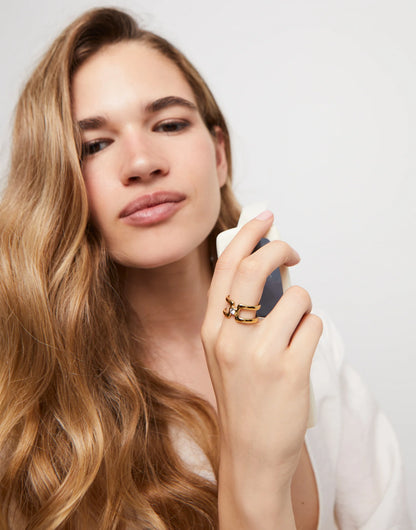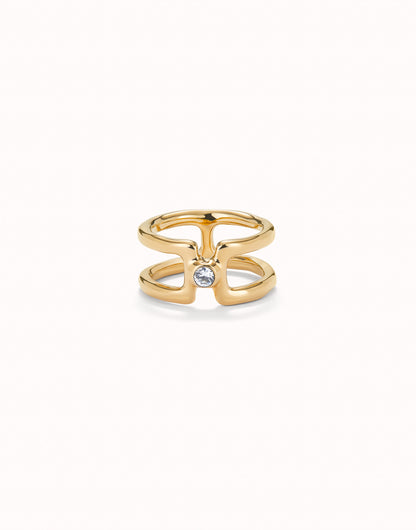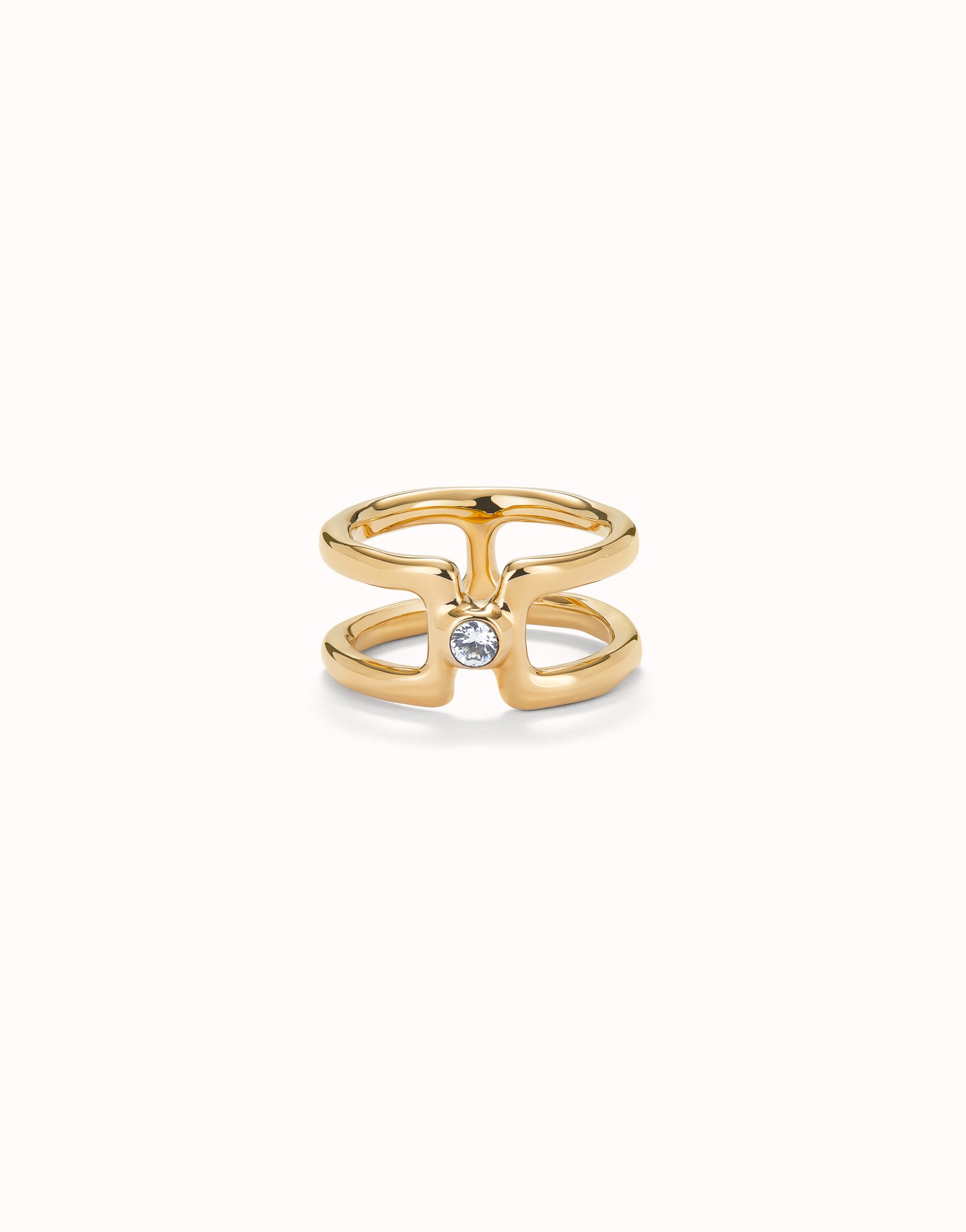Double 18K gold-plated ring with white central topaz. Made in Spain with a 100% handmade process. A collection in which topaz, clean lines and geometric shapes become protagonists, without filters. A collection ready to wear at any time or situation. Discover the collection ser indomable.