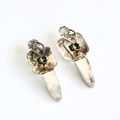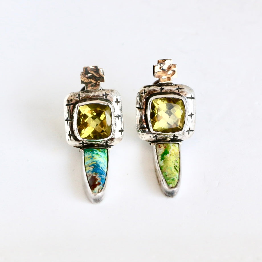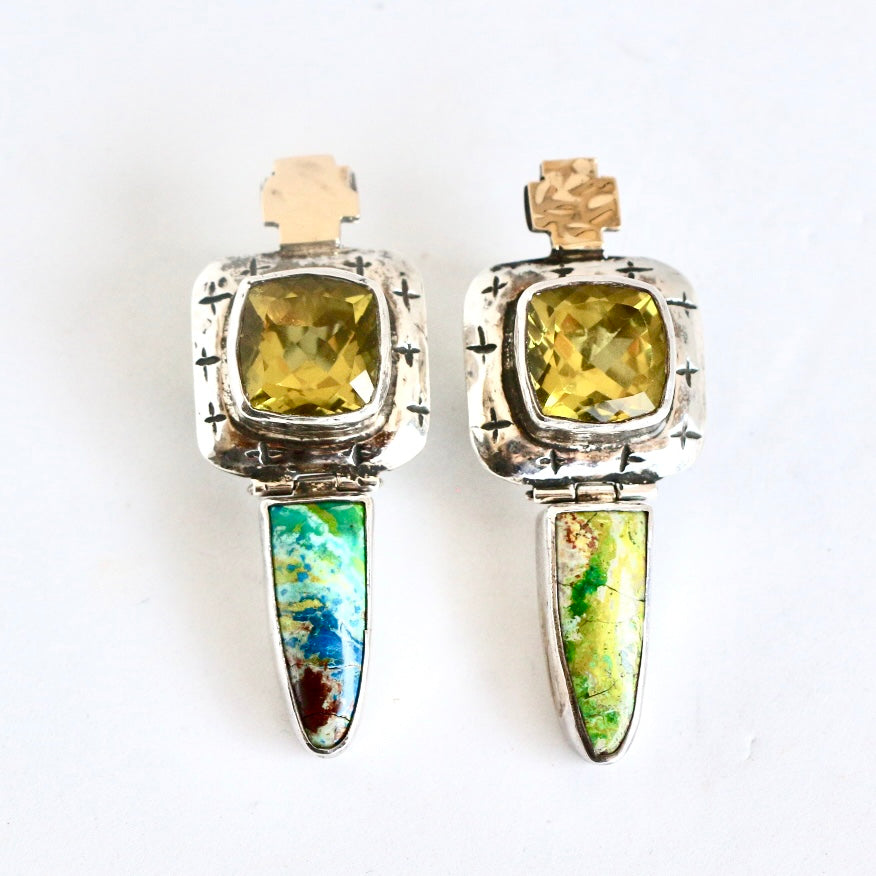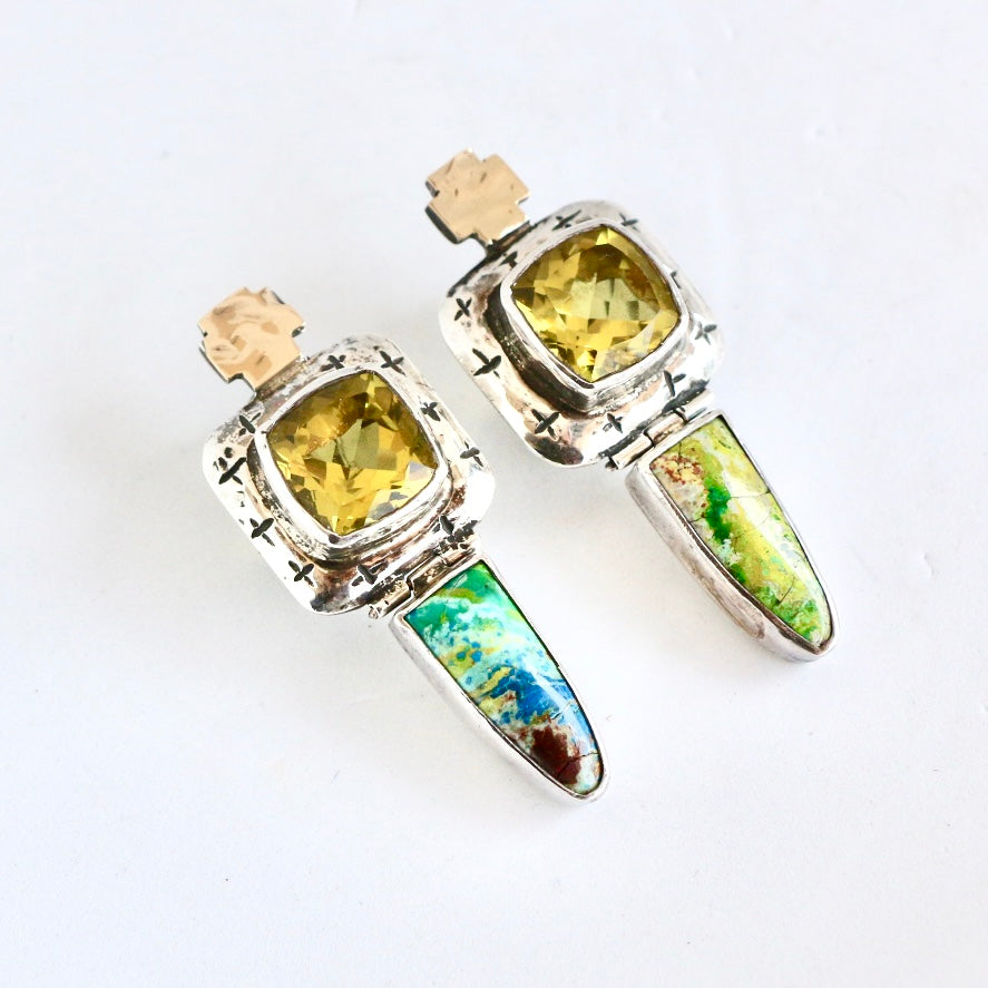 Adorn yourself with these exquisite square-cut green citrine gemstones, meticulously set in fine sterling silver. These distinguished earrings feature elegant blue-green turquoise drops that gracefully complement the refined 14kt gold crosses at the top. Made with premium post backings and sophisticated hinged loops, these signature pieces ensure secure wear throughout your most distinguished engagements. One-of-a-kind and bursting with personality, these gem-tastic earrings are like having your own exclusive ticket to the sparkle party! Perfect for jewelry lovers who like to wink at tradition while collecting all the compliments!