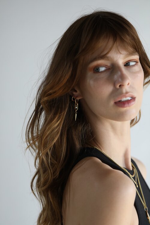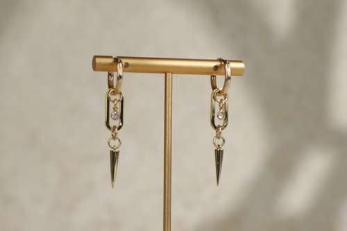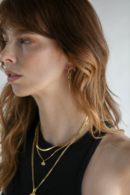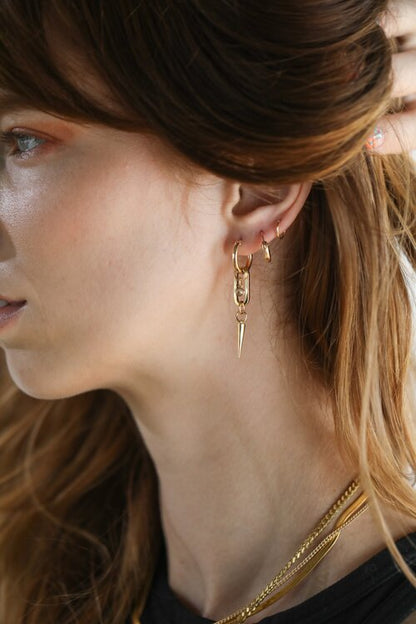 15mm gold-filled huggie and rectangle link, spike, and bezel charm.
