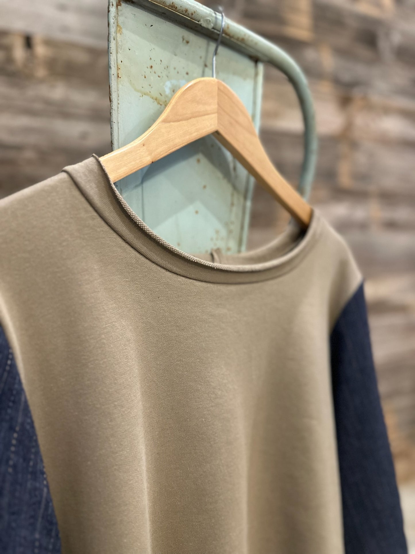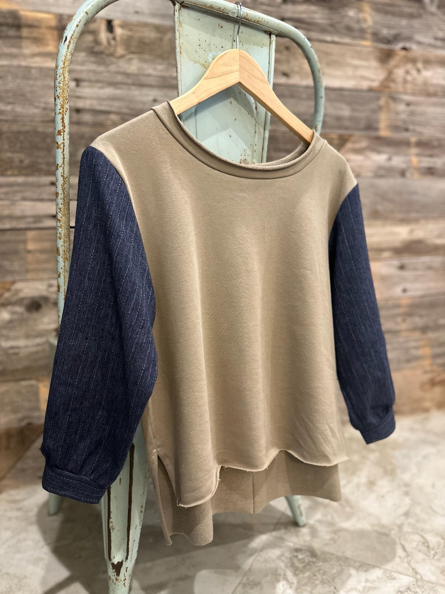 Elevate your fashion game with this khaki knit top! The denim puff sleeves bring some attitude with a high low hemline, raw edge hems, and a wide circle neckline. The back patch adds a touch of edge, just what you need to slay the fashion scene with a hint of opulence!