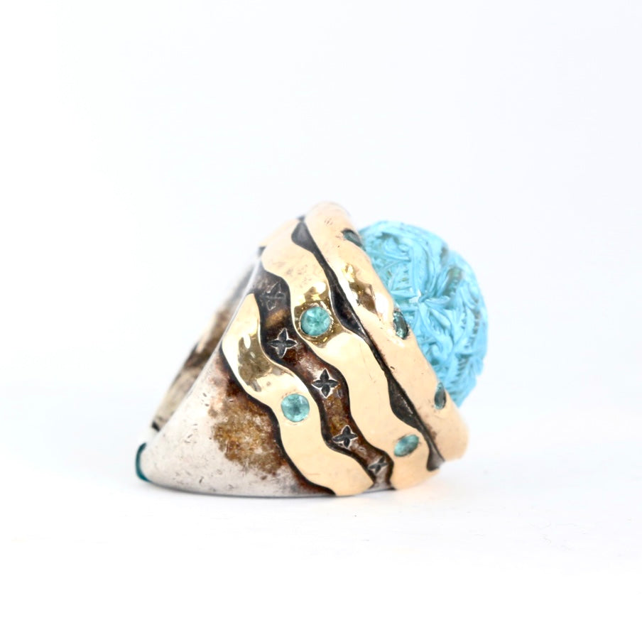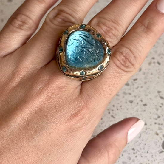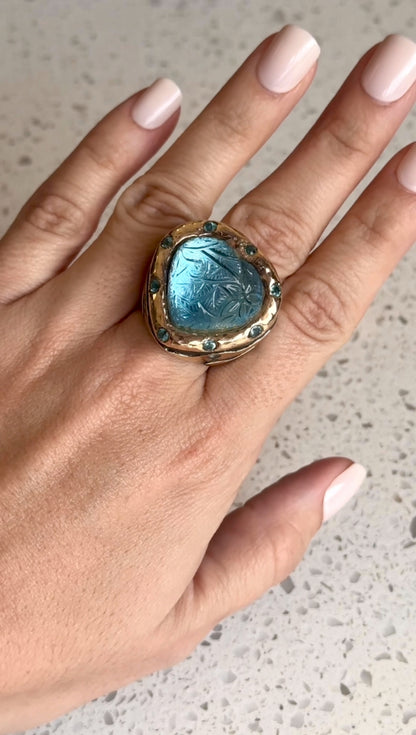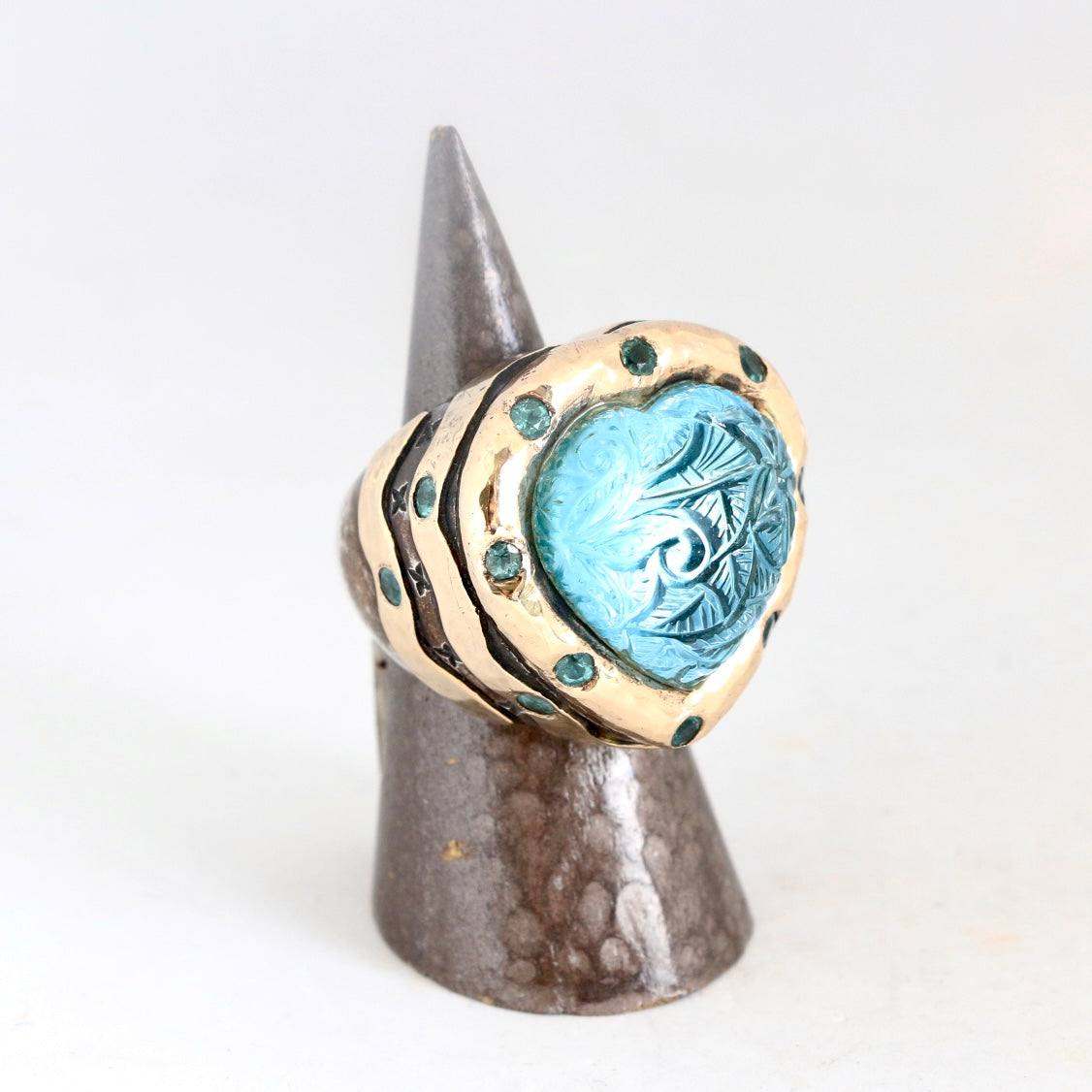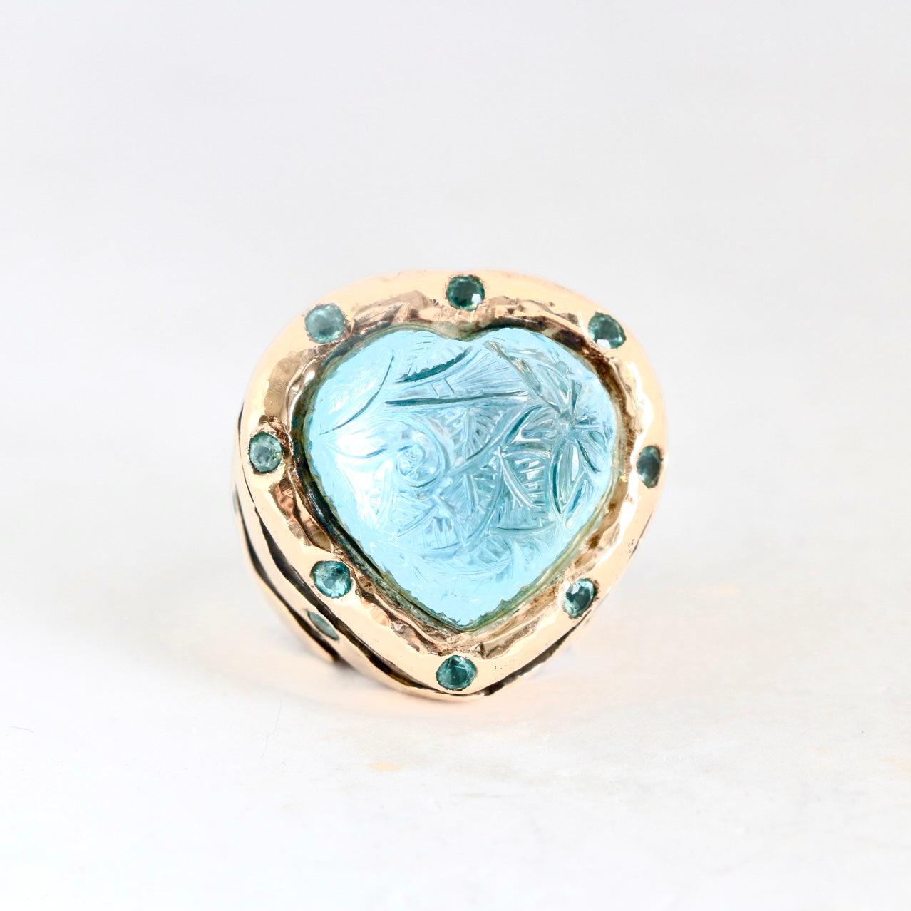 Large Heart Engraved Blue Topaz Set in Gold and Blue Topaz "Signature" Ring