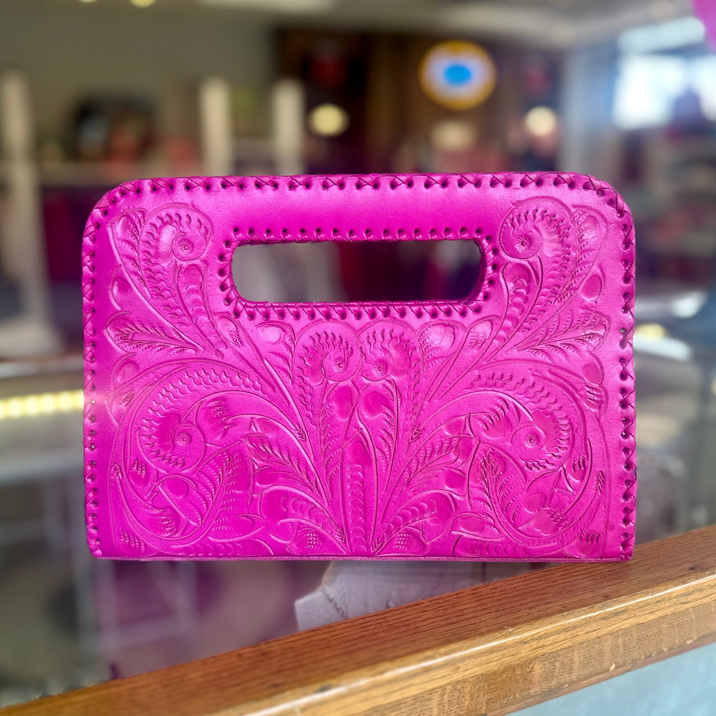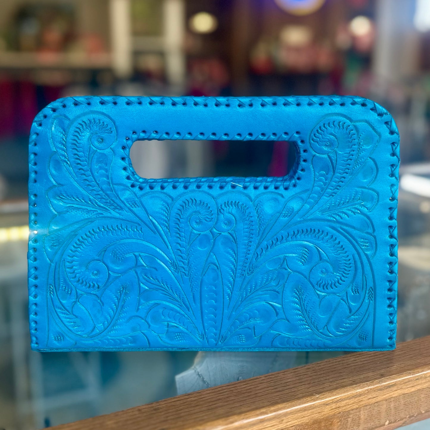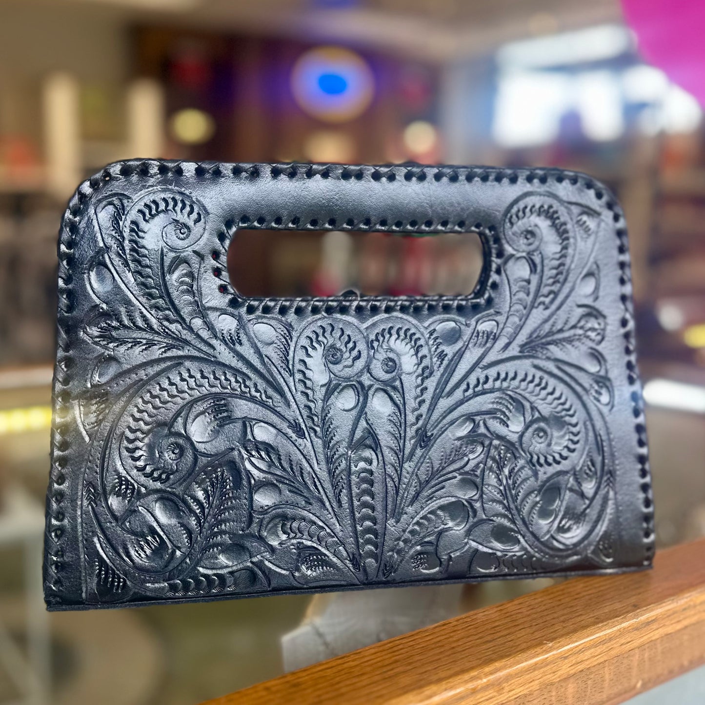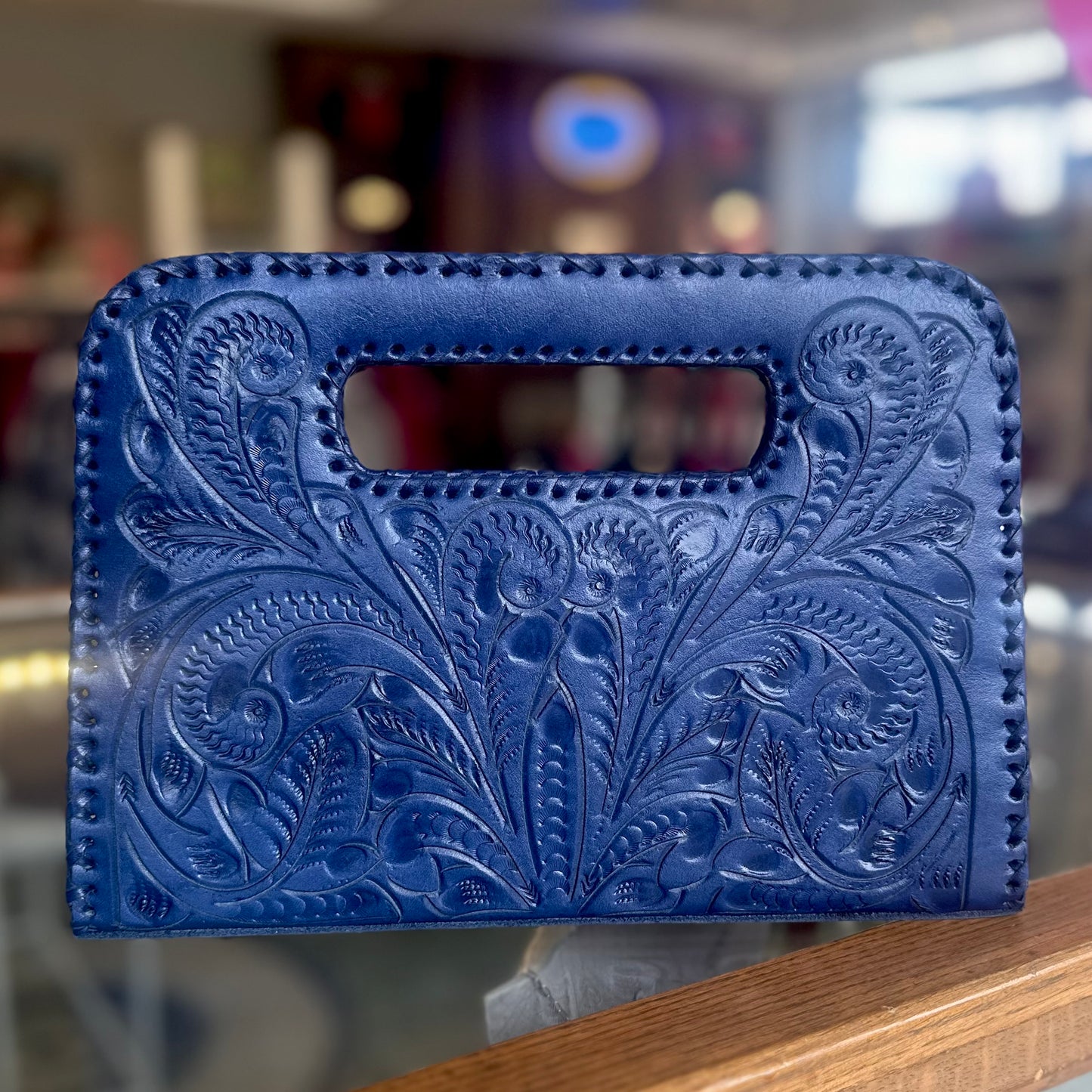 Each beautiful Alexis David creation is of the highest quality hand-tooled, hand-dyed leather, uniquely crafted and hand laced in a variety of gorgeously deep, rich colors to suit every mood and every season! The embossed hand-tooling is deep and detailed in intricate designs that suit the particular style of each clutch.