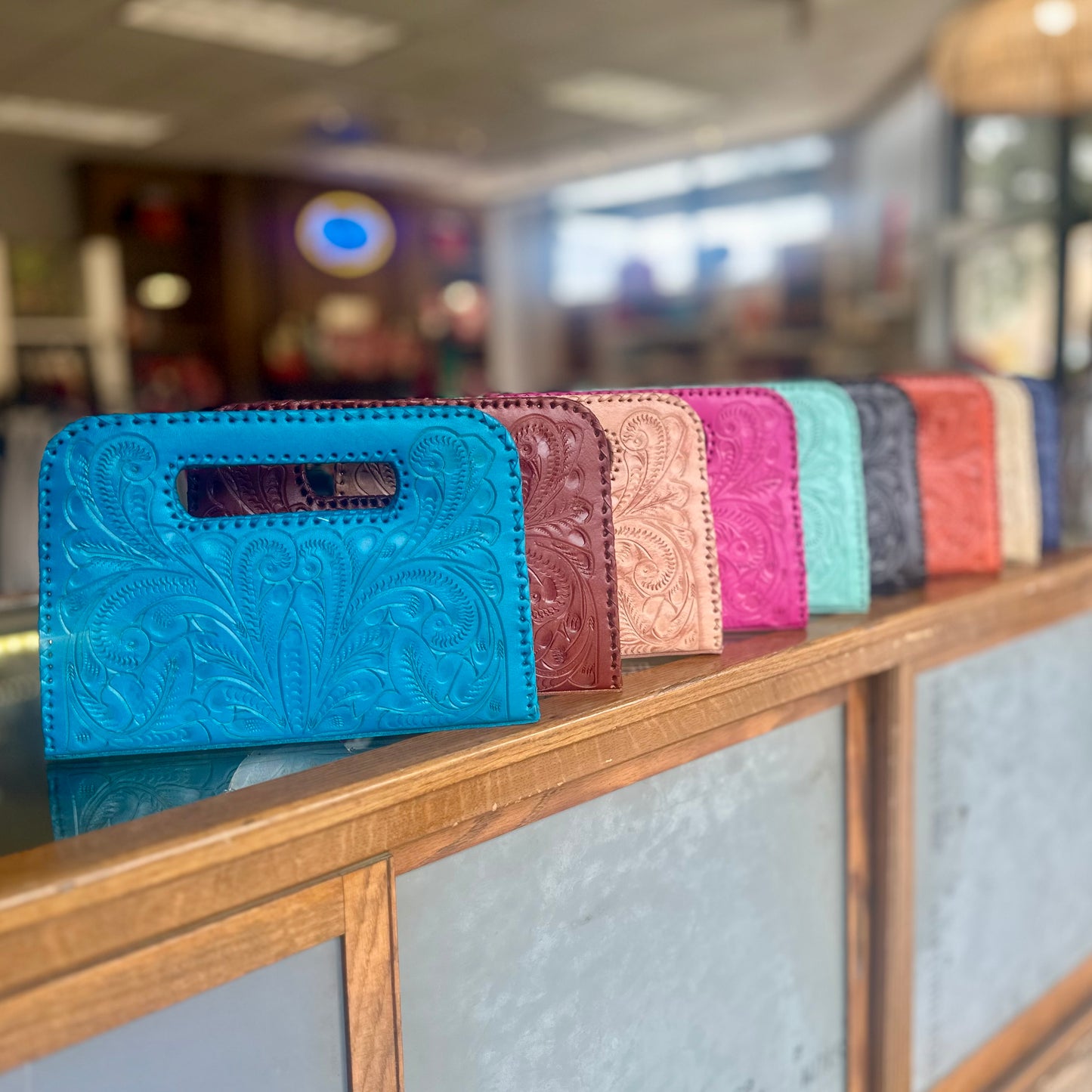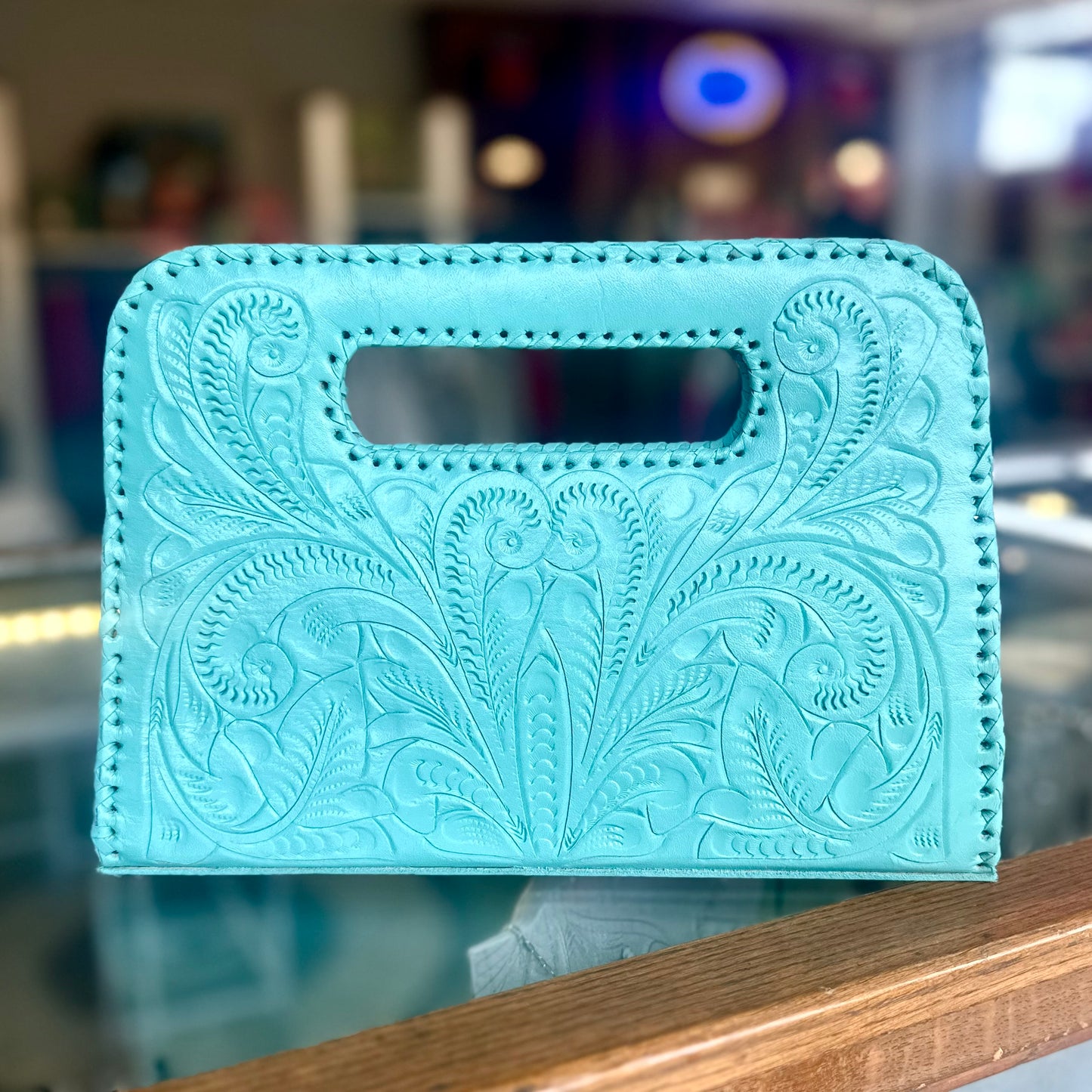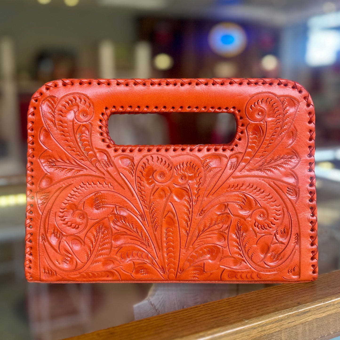Each beautiful Alexis David creation is of the highest quality hand-tooled, hand-dyed leather, uniquely crafted and hand laced in a variety of gorgeously deep, rich colors to suit every mood and every season! The embossed hand-tooling is deep and detailed in intricate designs that suit the particular style of each clutch.