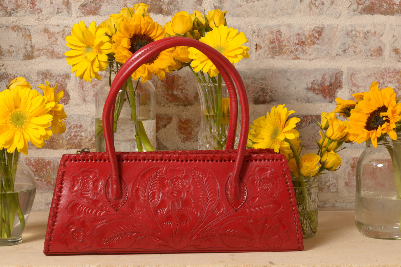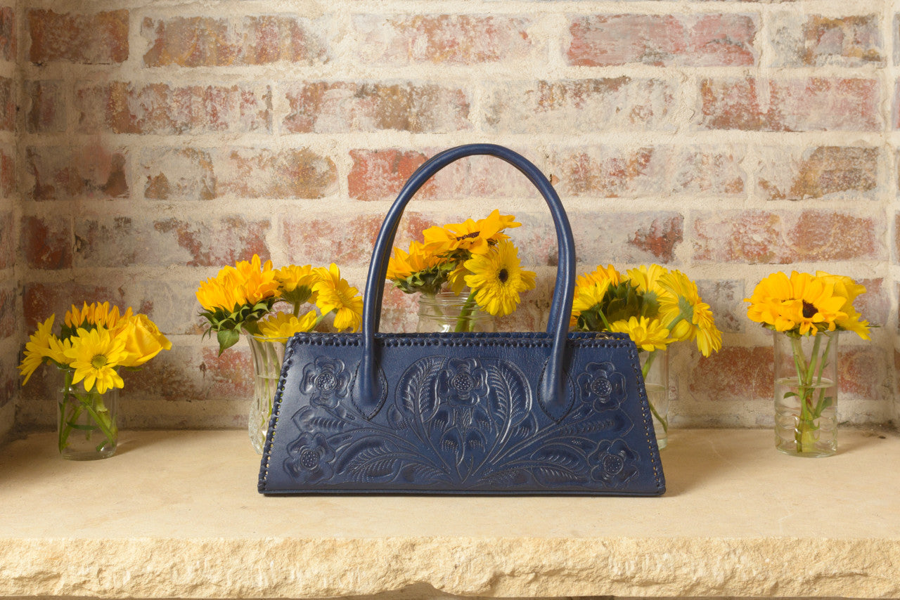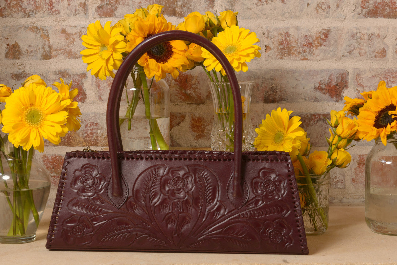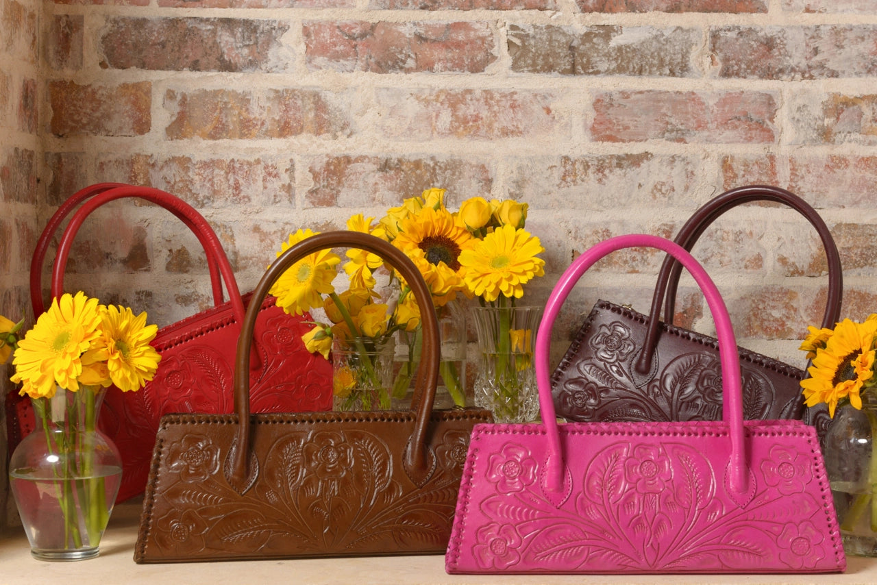 Each beautiful Alexis David creation is of the highest quality hand-tooled, hand-dyed leather, uniquely crafted and hand laced in a variety of gorgeously deep, rich colors to suit every mood and every season! The embossed hand-tooling is deep and detailed in intricate designs that suit the particular style of each bag.