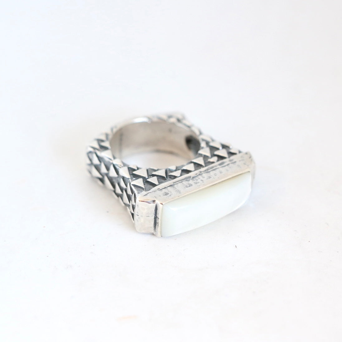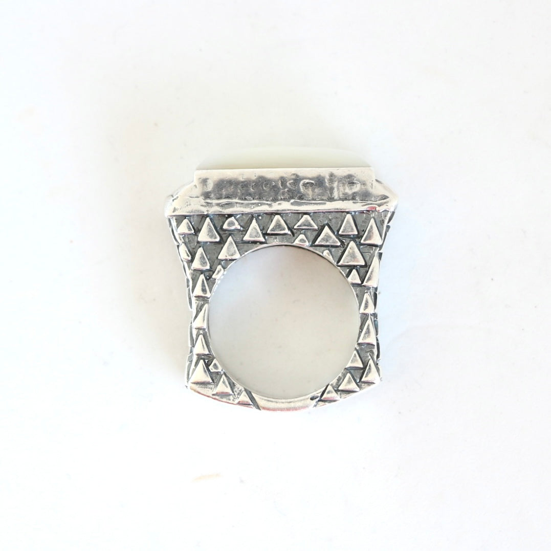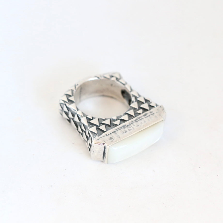Mother of Pearl top stacker ring with triangle designed shank, great to pair with other stacker rings