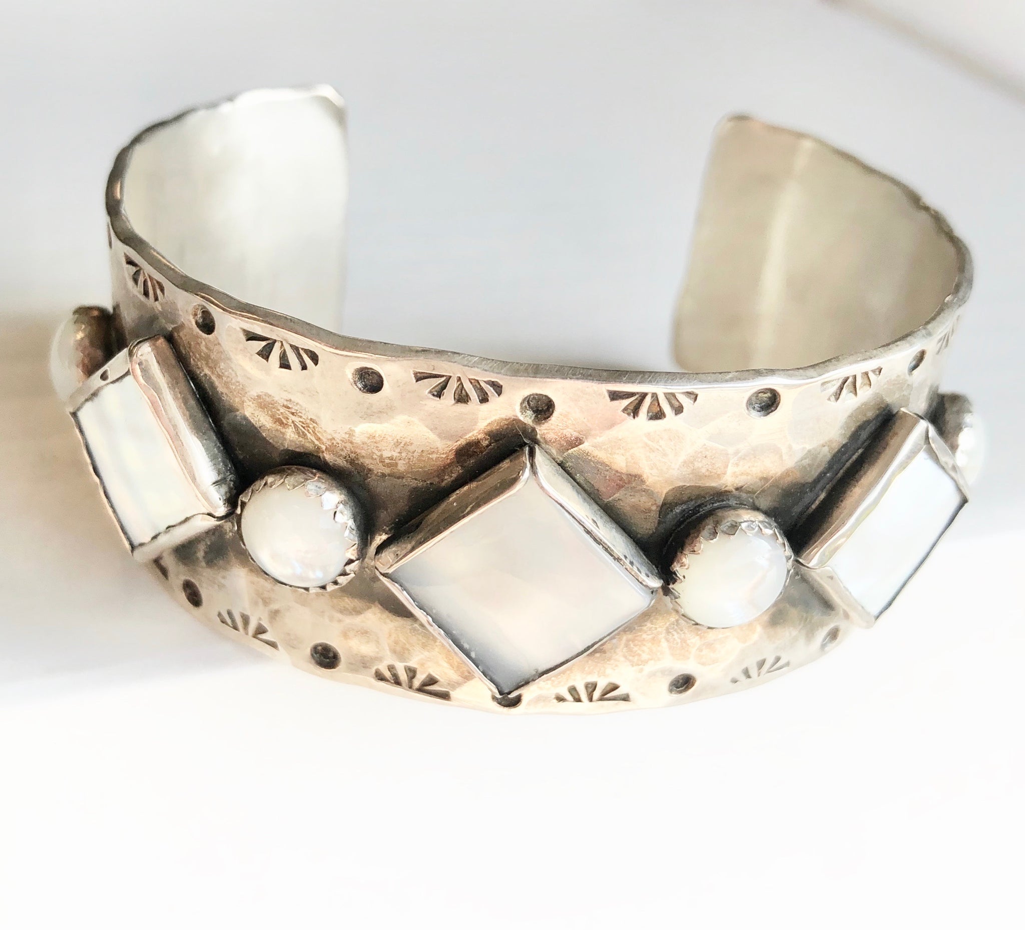 - 1" sterling silver hammered cuff with alternating shapes of mother of pearl stones with detailing on side edges