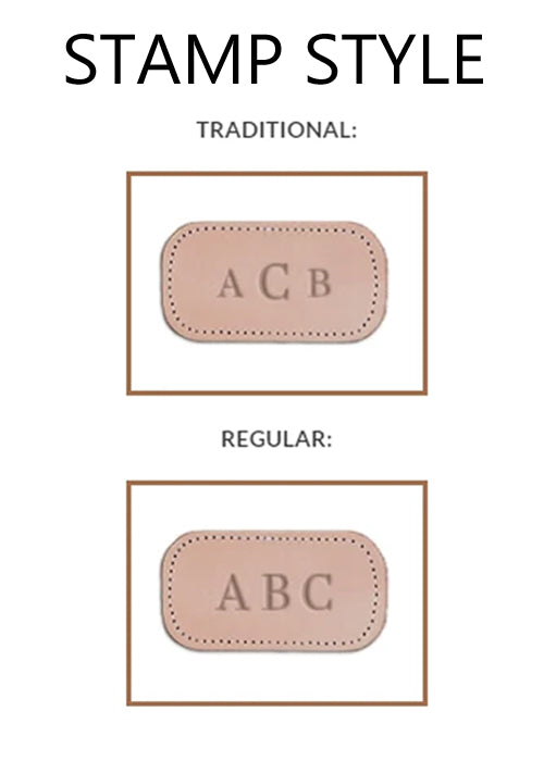 Traditional (Monogram) Hot Stamp: First Initial, Last Initial (Larger in Center), Middle Initial.