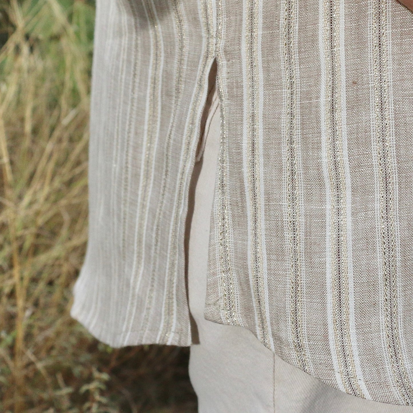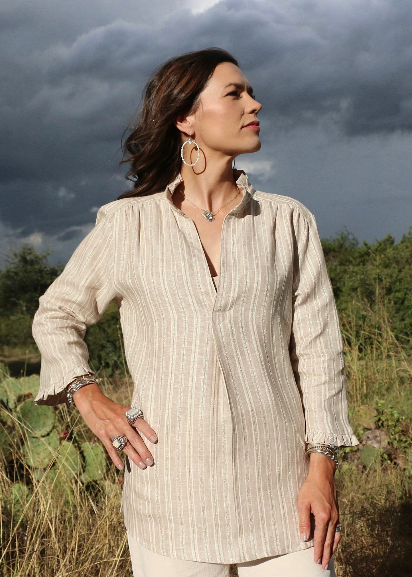 Introducing our Ruffle Collar Shirt, featuring luxurious gold lurex pin stripes and a sleek, sophisticated silhouette. This blouse boasts a v-slit neckline with a pleat for a flattering effect, adorned with a ruffle collar and detailed ruffles on the sleeves. With a slight high low hemline, it exudes elegance and is perfect for any occasion. Elevate your style with its refined and exclusive charm!