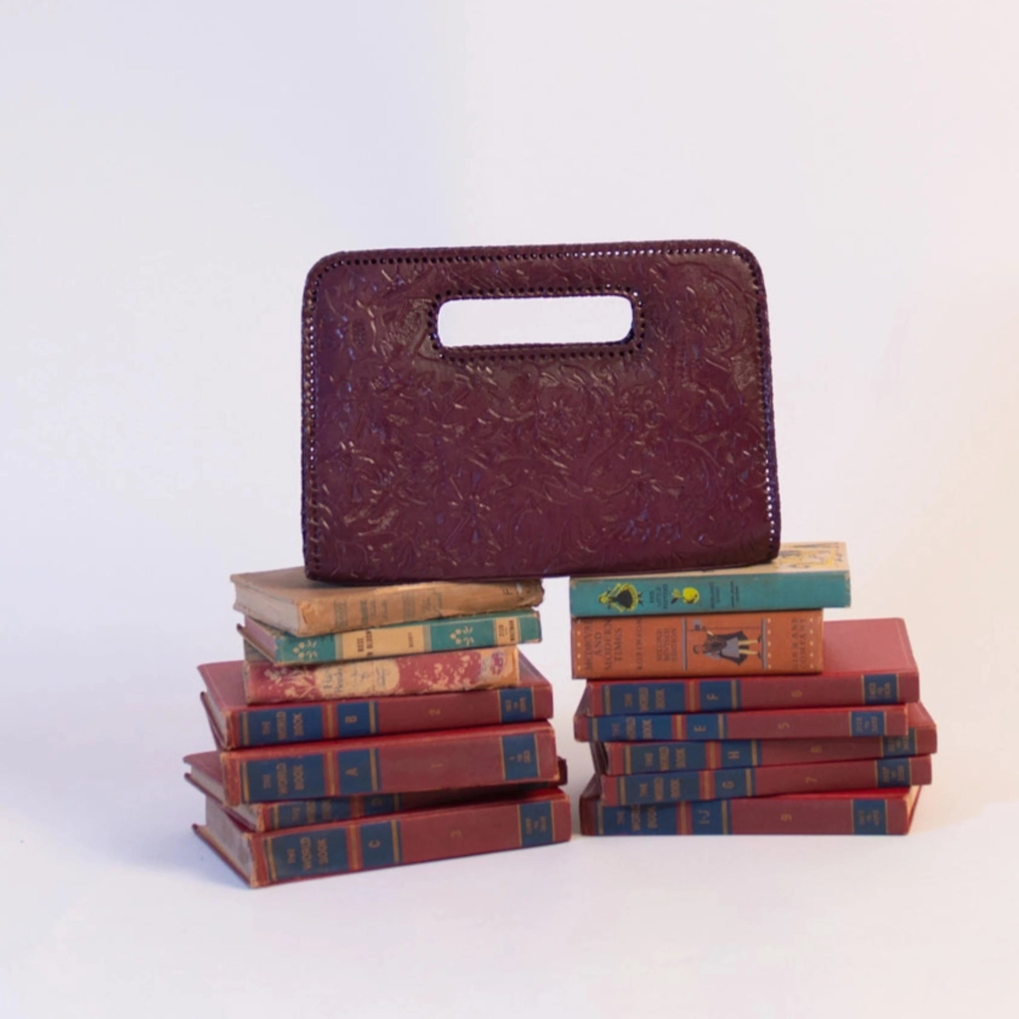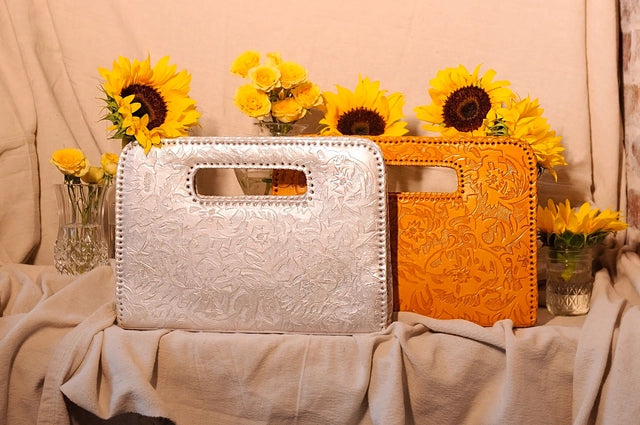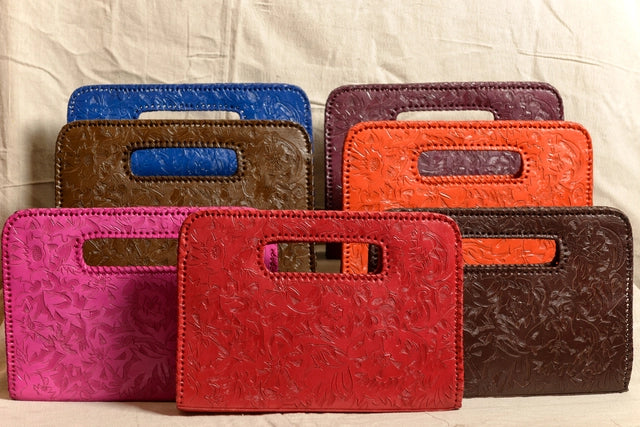 Each beautiful Alexis David creation is of the highest quality hand-tooled, hand-dyed leather, uniquely crafted and hand laced in a variety of gorgeously deep, rich colors to suit every mood and every season! The embossed hand-tooling is deep and detailed in intricate designs that suit the particular style of each clutch.